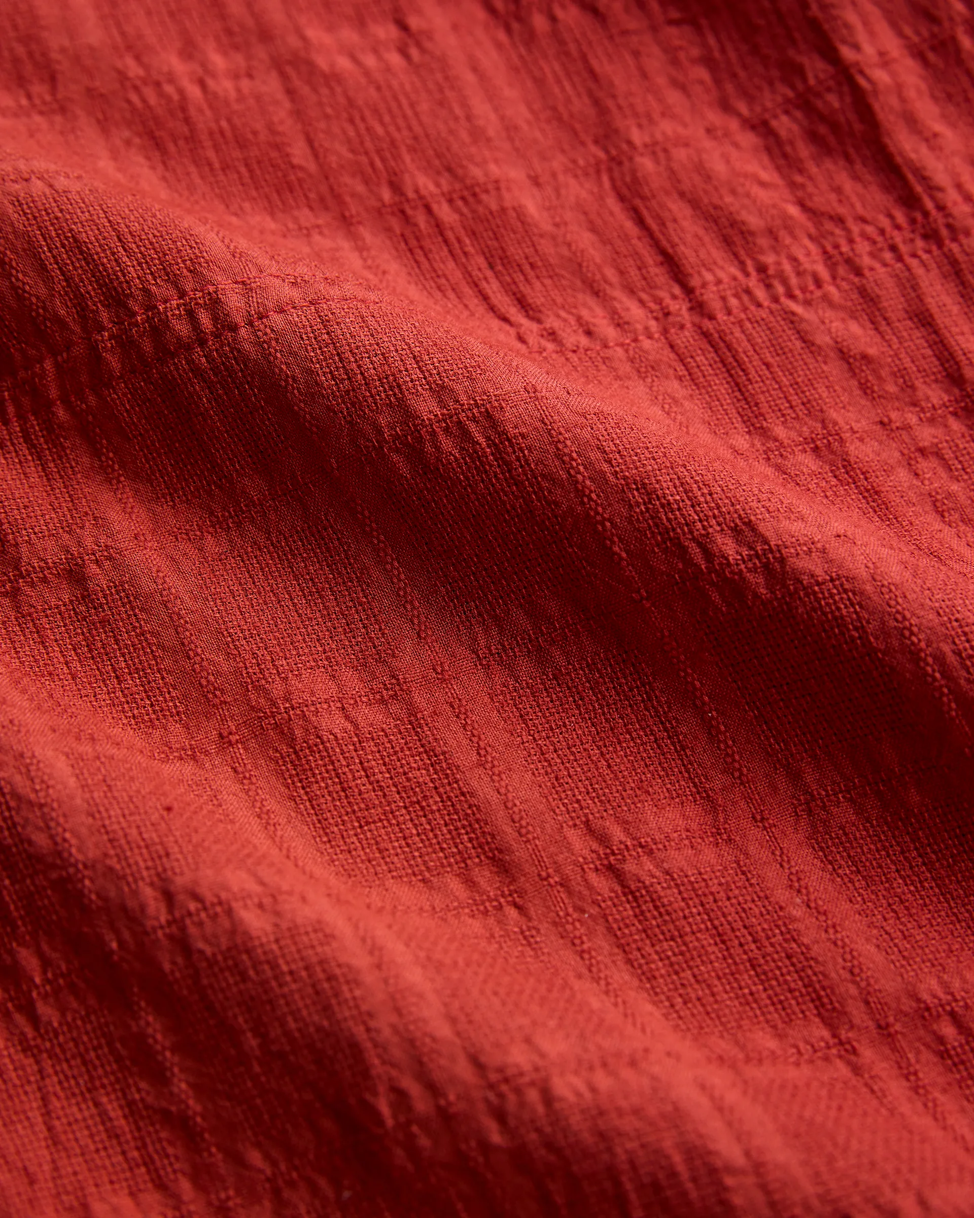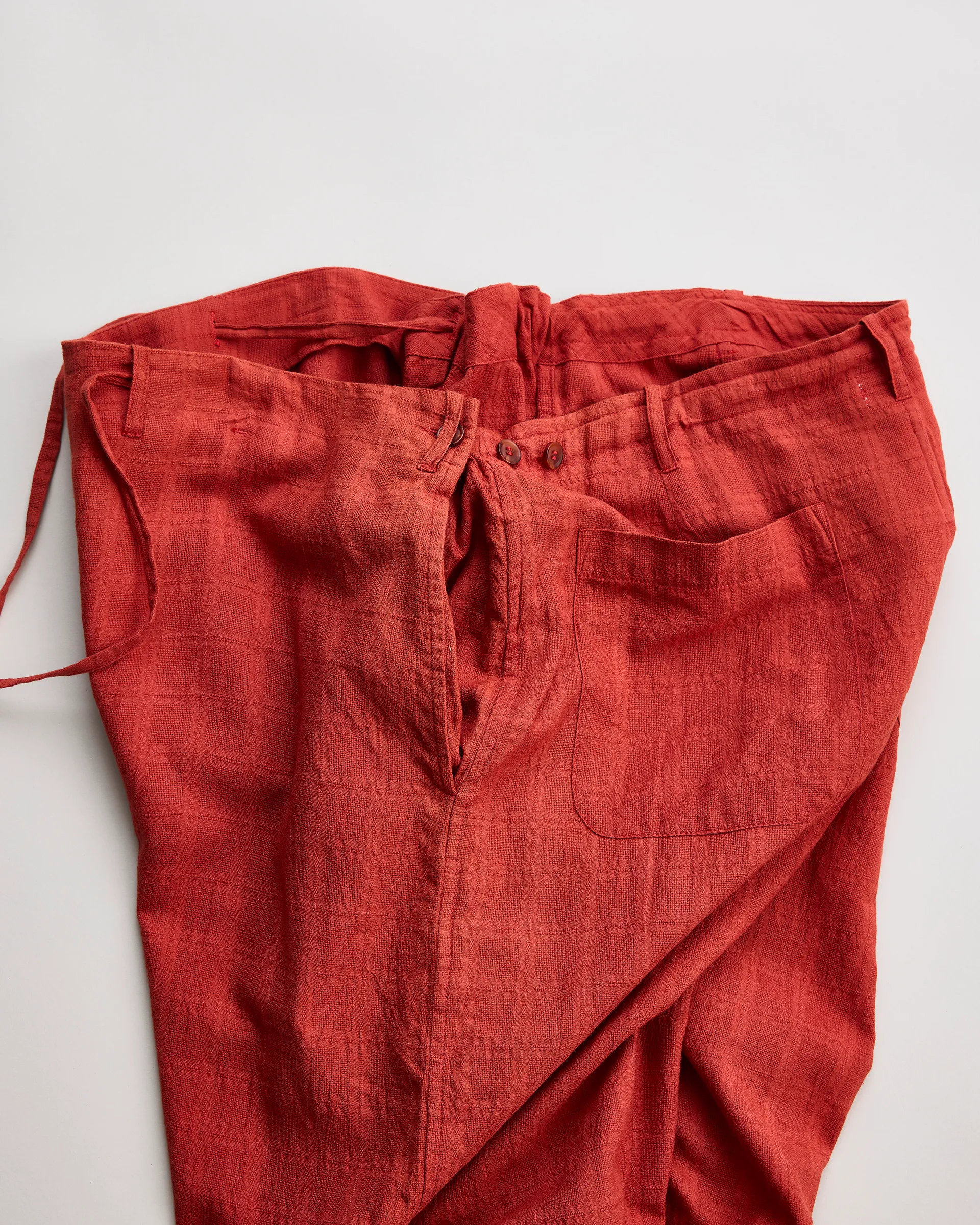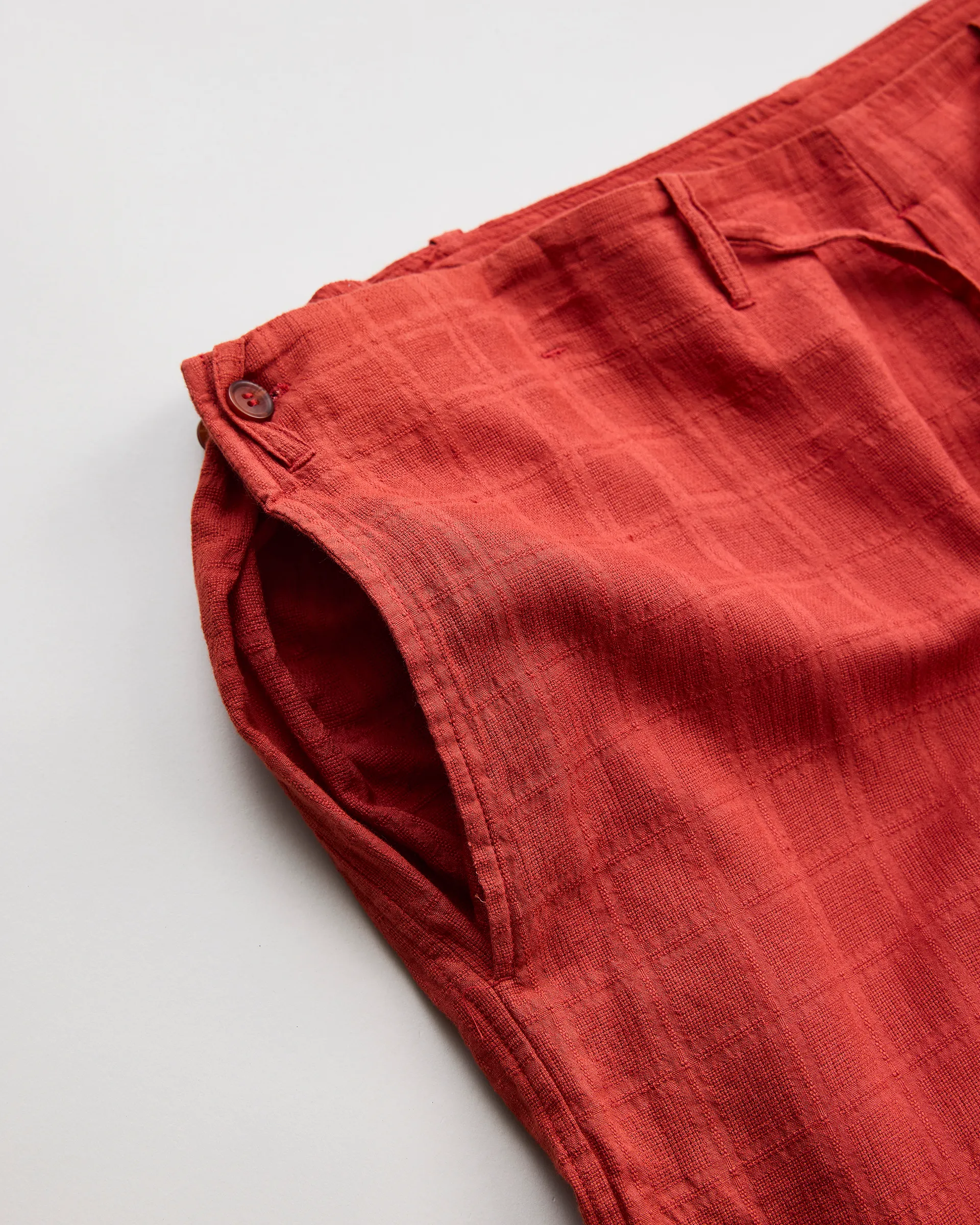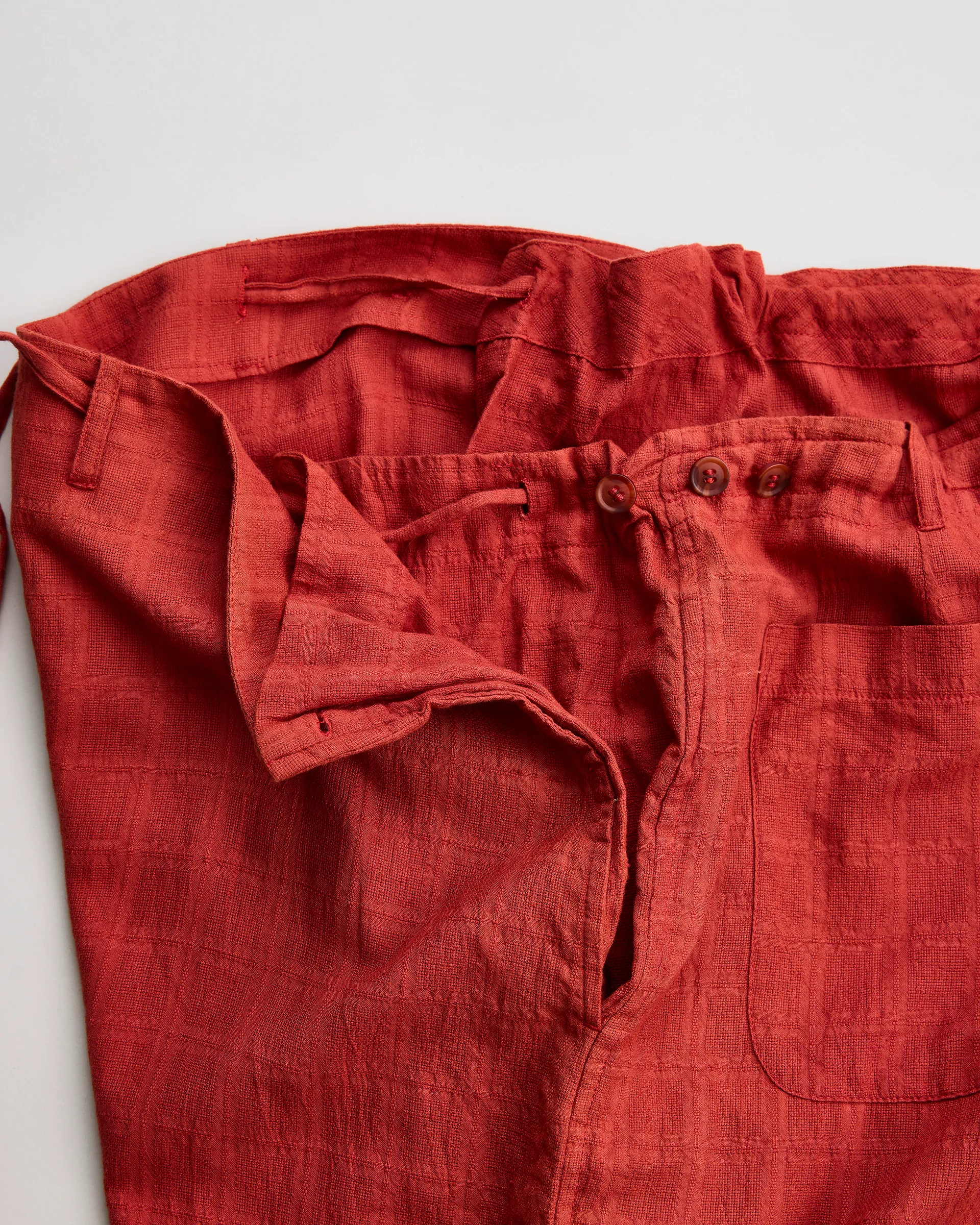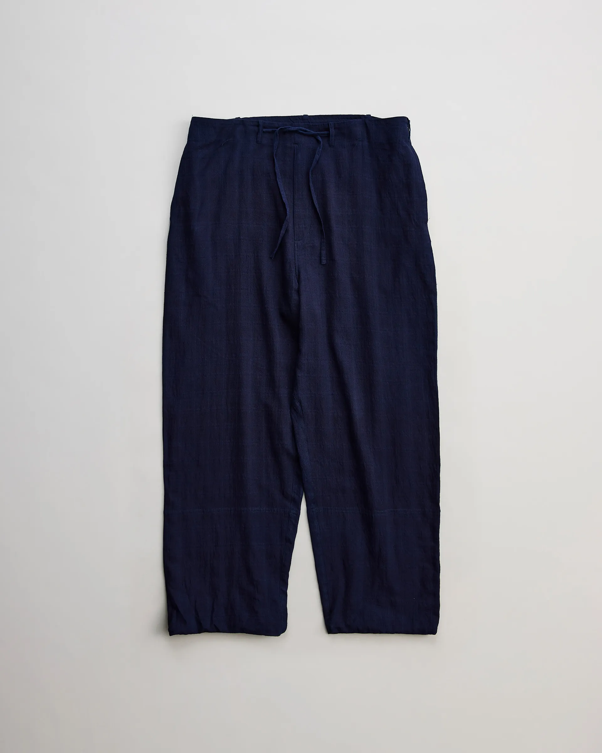 手紡ぎ・手織りのカディコットンに草木染めを施したジャカードチェック生地で製作したクルタパンツ。南アジアの伝統衣装「クルタパンツ」と、ヨーロッパのサイド開きセーラーパンツの構造を掛け合わせたハイブリッドデザイン。生地は特殊な手織りジャカード織機を用い、ドビー織りや絡み織りなど多様な技法を織り交ぜて奥行きのある独自のチェック柄を表現。ウエストはイージーパンツ仕様とし、快適な着用感と動きやすさを両立させています。伝統技法と異文化要素を現代的に再構築したNICENESSらしさが光る一着です。