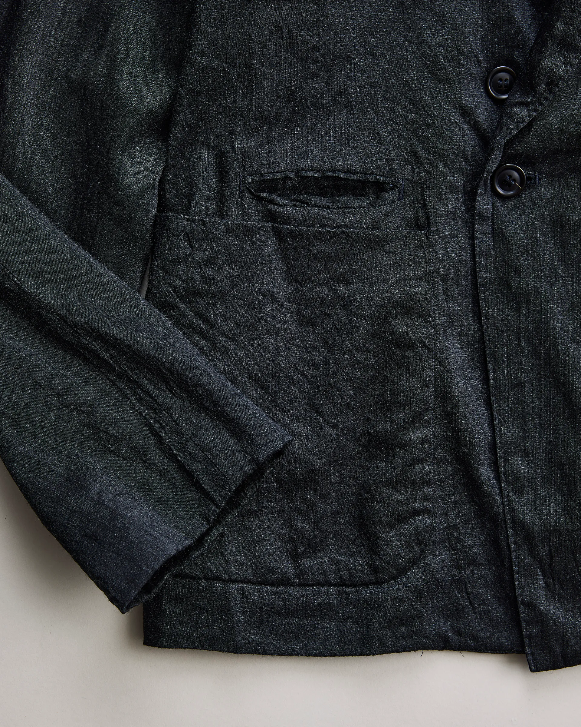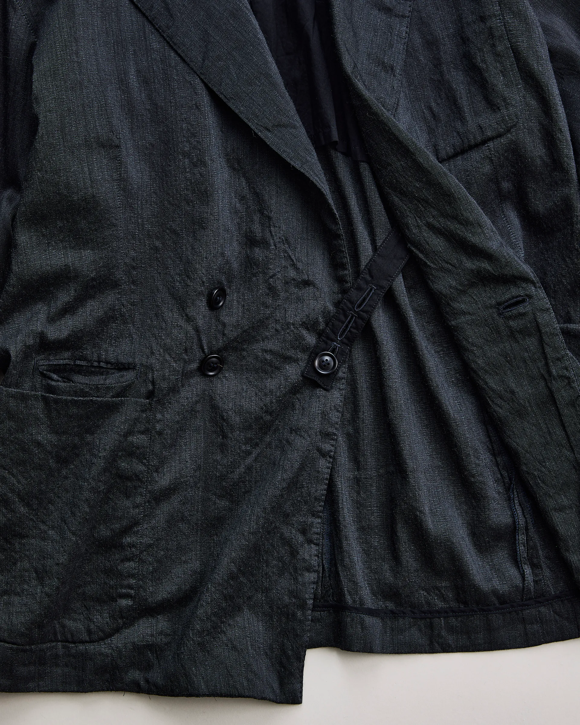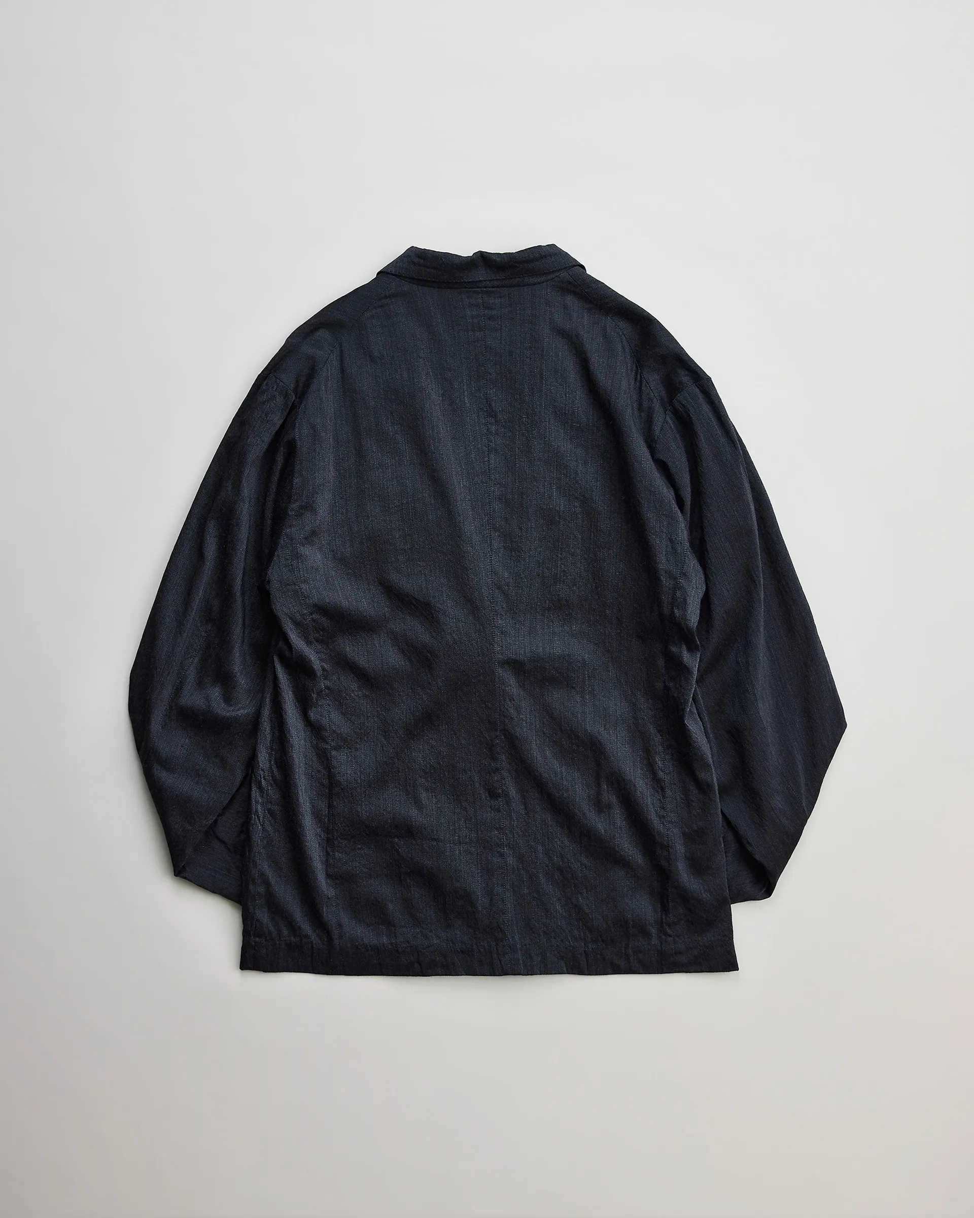 タテ糸にシルク、ヨコ糸に強撚単糸のウールを打ち込んだ交織の平織生地で製作したダブルブレストジャケット。型はフランスのクラシカルなテーラードスタイルとイギリスのダブルブレストジャケットの構造美をリファレンスとし、伝統的要素を踏まえ現代的にアップデート。生地はシルクの上品な光沢とウールTOP糸による深みのある色合いが融合し、静かな存在感を放つテキスタイルに仕上がっています。構築的なダブルブレスト仕様に袖には立体的な一枚仕立てを取り入れ、柔軟性と快適な着心地、重厚感と軽やかさを併せ持つ仕立てです。