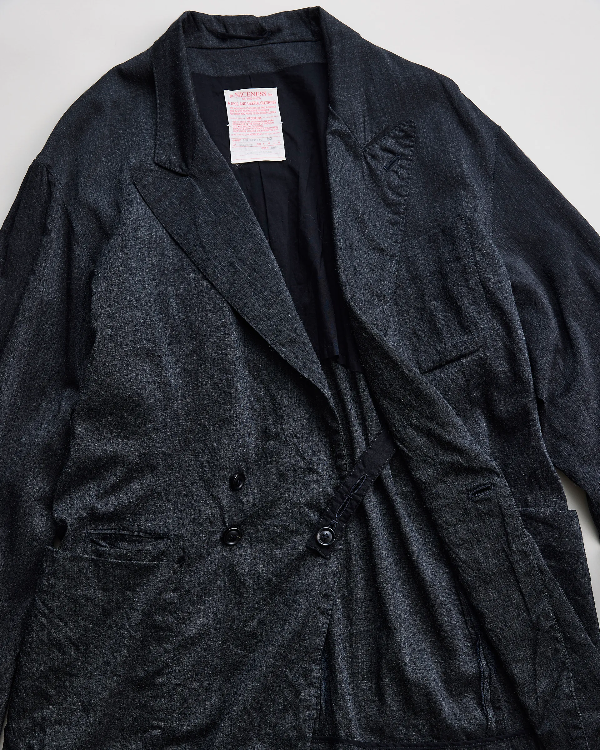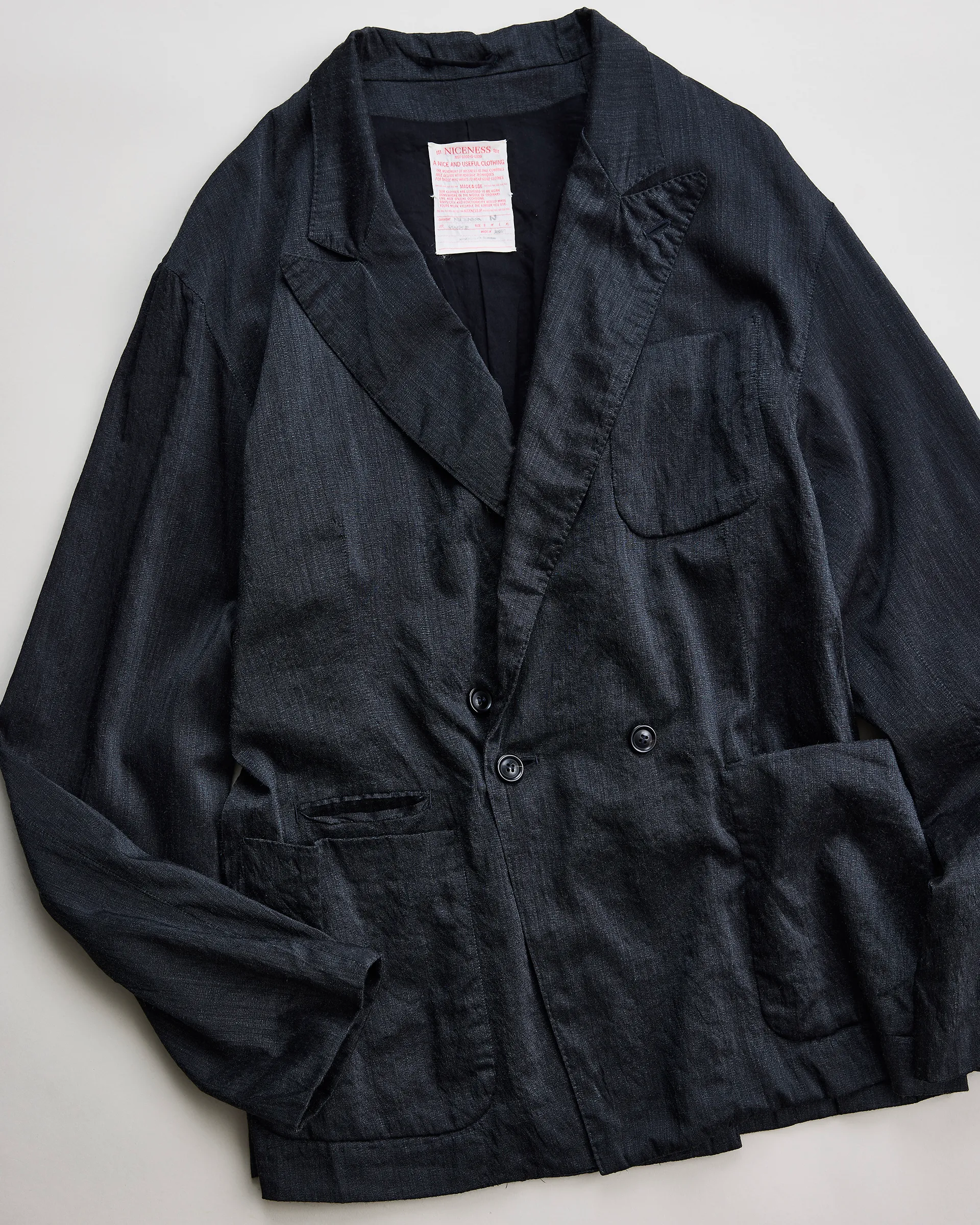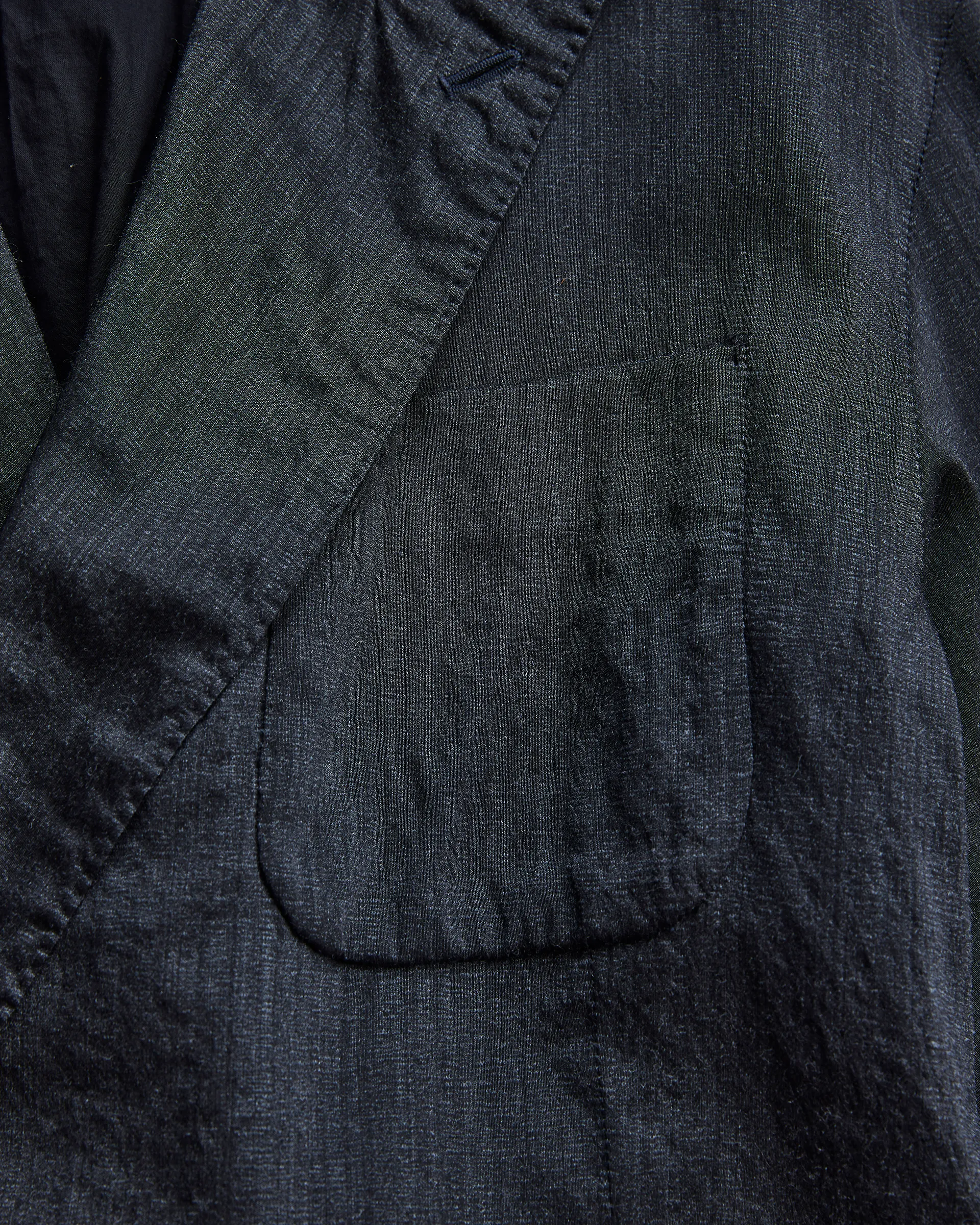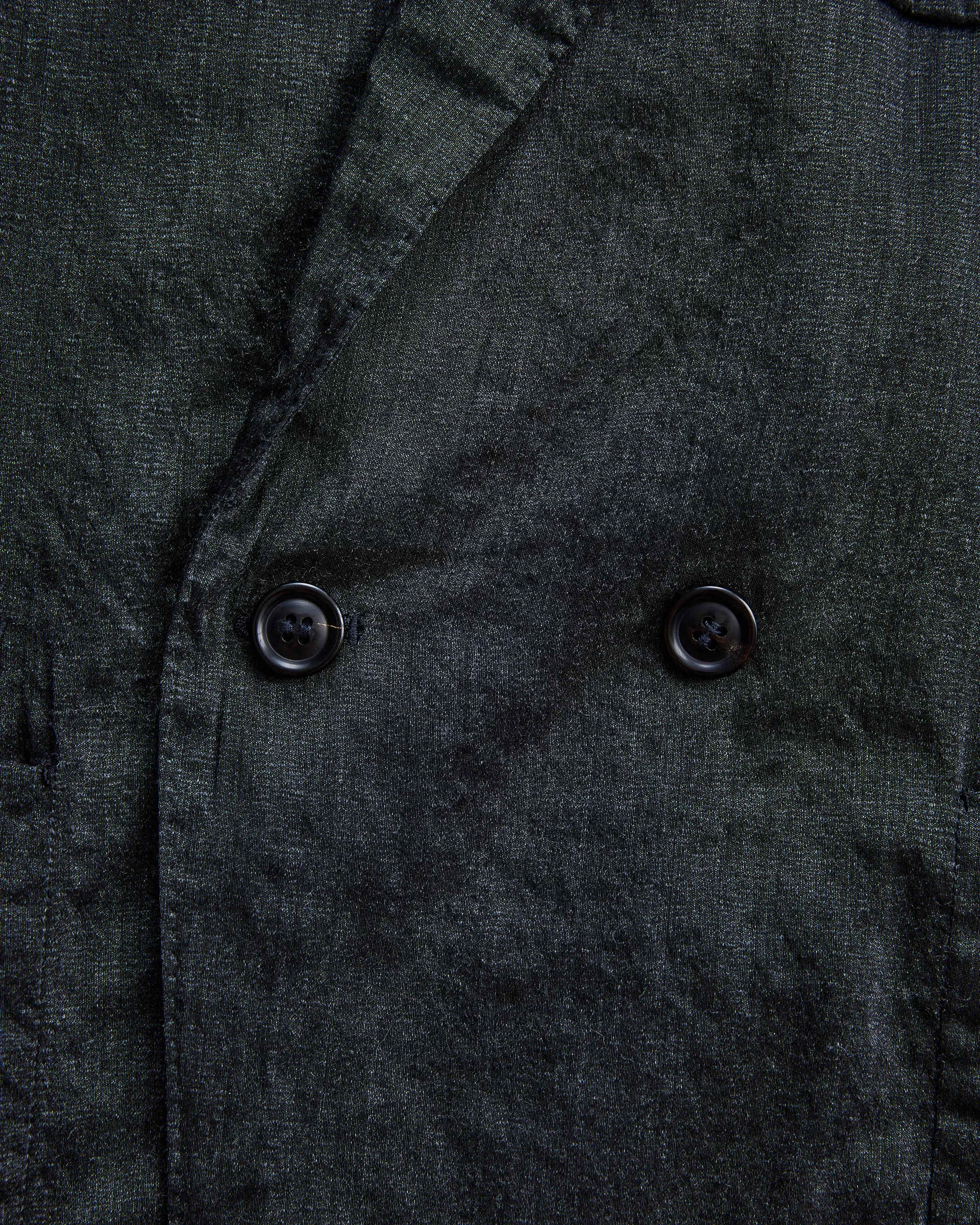 タテ糸にシルク、ヨコ糸に強撚単糸のウールを打ち込んだ交織の平織生地で製作したダブルブレストジャケット。型はフランスのクラシカルなテーラードスタイルとイギリスのダブルブレストジャケットの構造美をリファレンスとし、伝統的要素を踏まえ現代的にアップデート。生地はシルクの上品な光沢とウールTOP糸による深みのある色合いが融合し、静かな存在感を放つテキスタイルに仕上がっています。構築的なダブルブレスト仕様に袖には立体的な一枚仕立てを取り入れ、柔軟性と快適な着心地、重厚感と軽やかさを併せ持つ仕立てです。