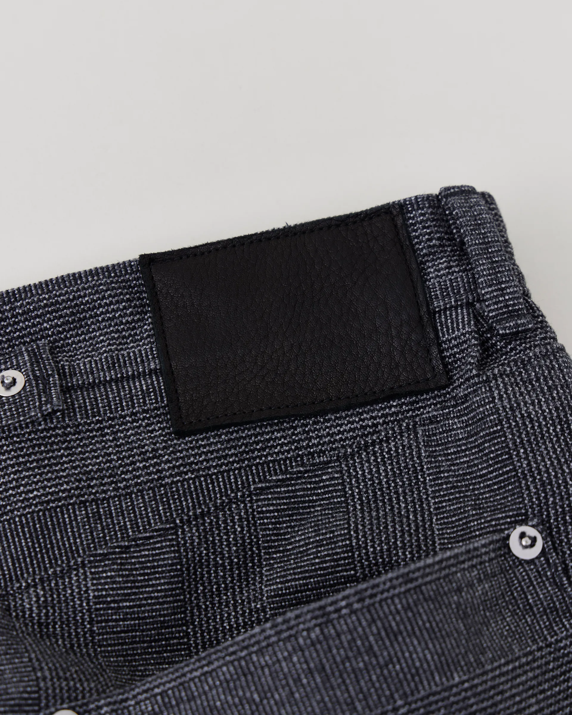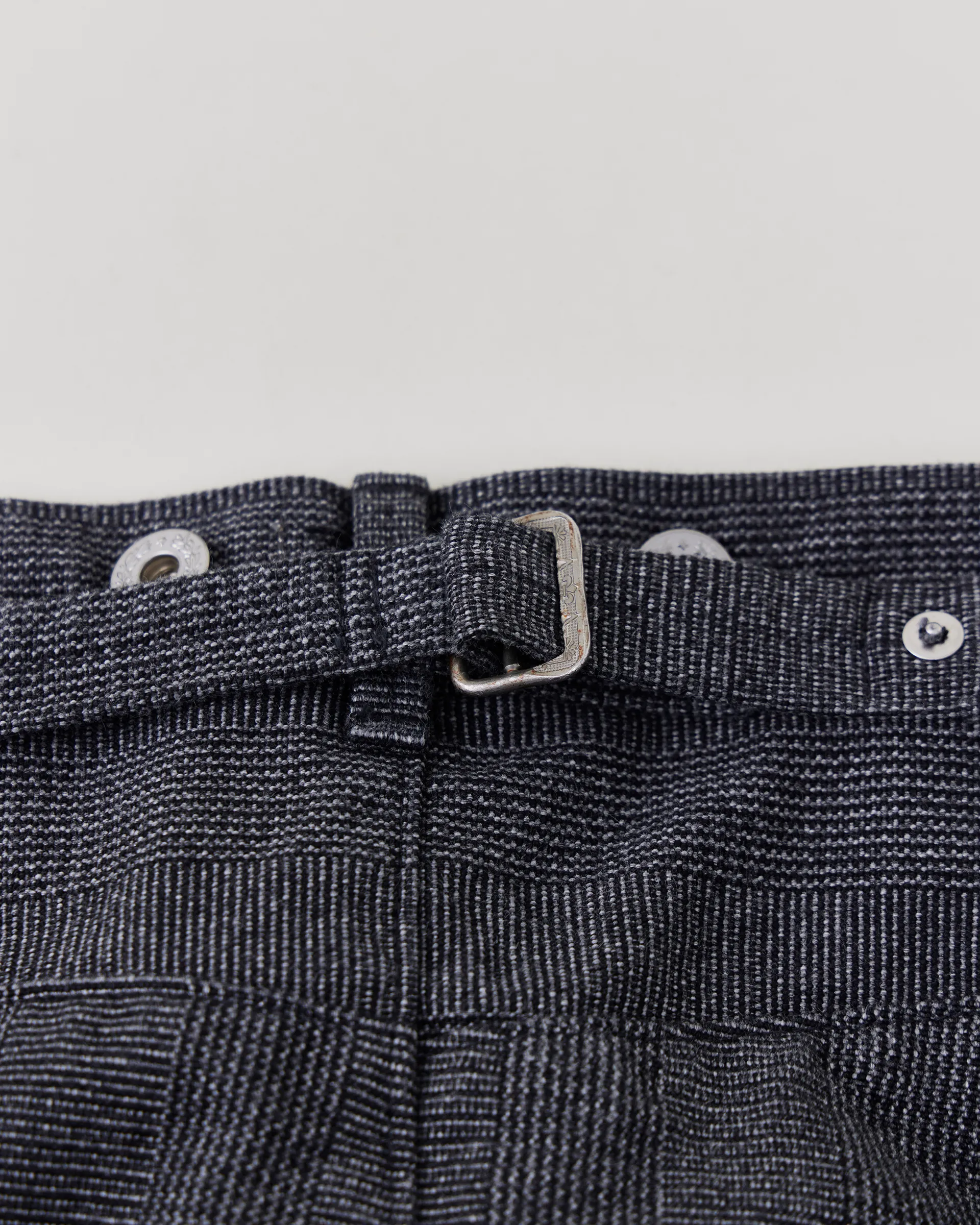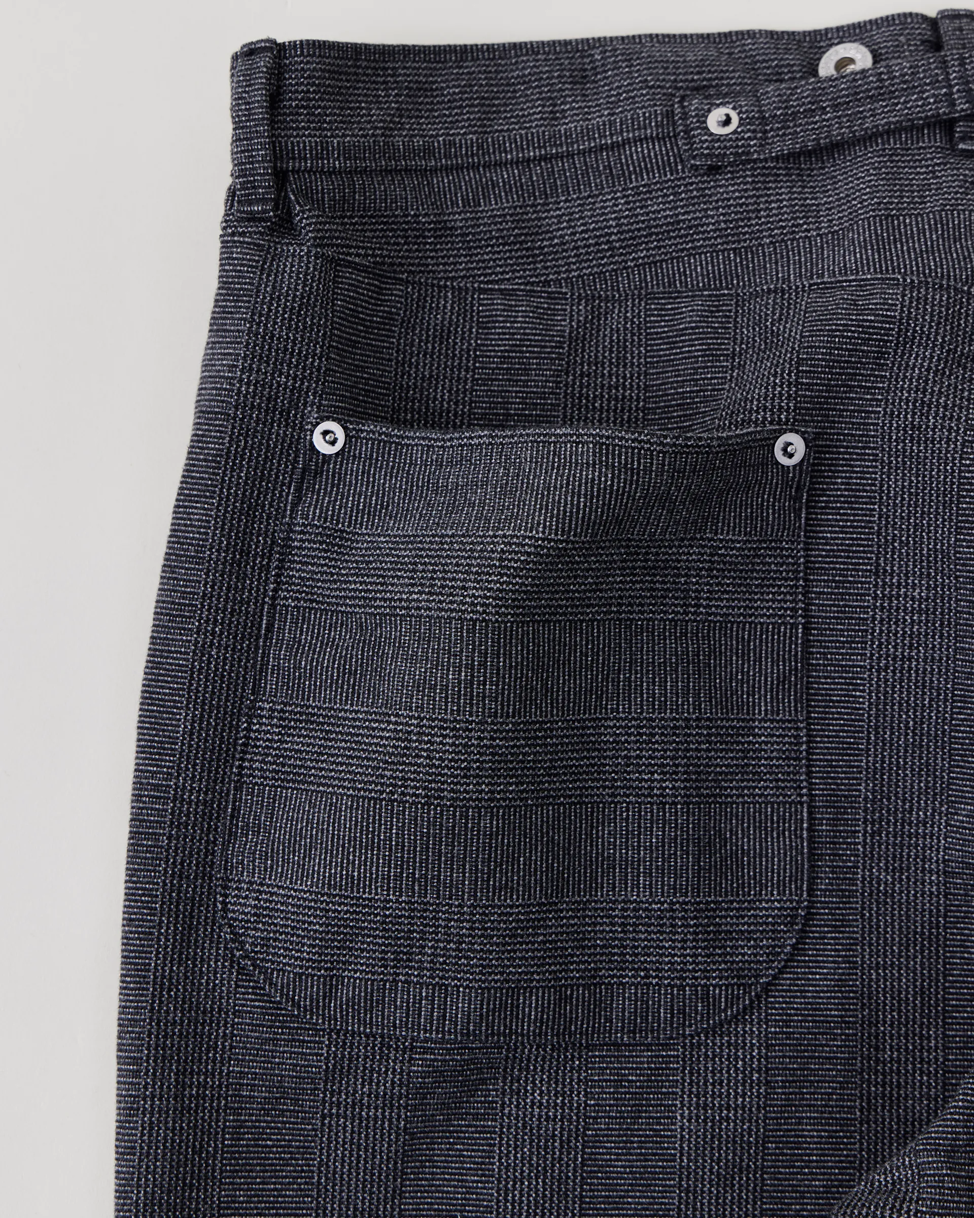 通常はカバンなどに使用する帆布を服地として柔らかく織り上げた⽣地で仕立てたワークパンツ。1950〜60年代のUSダック生地の表情を漂わせる先染めグレンチェック柄を使用し、ワッシャー加工で仕上げています。右足はインシーム、左足はアウトシームでパターン構成し、ヴィンテージジーンズに見られる斜交感を表現しています。縫製やポケットの仕様にもヴィンテージライクなディテールを落とし込んでいます。