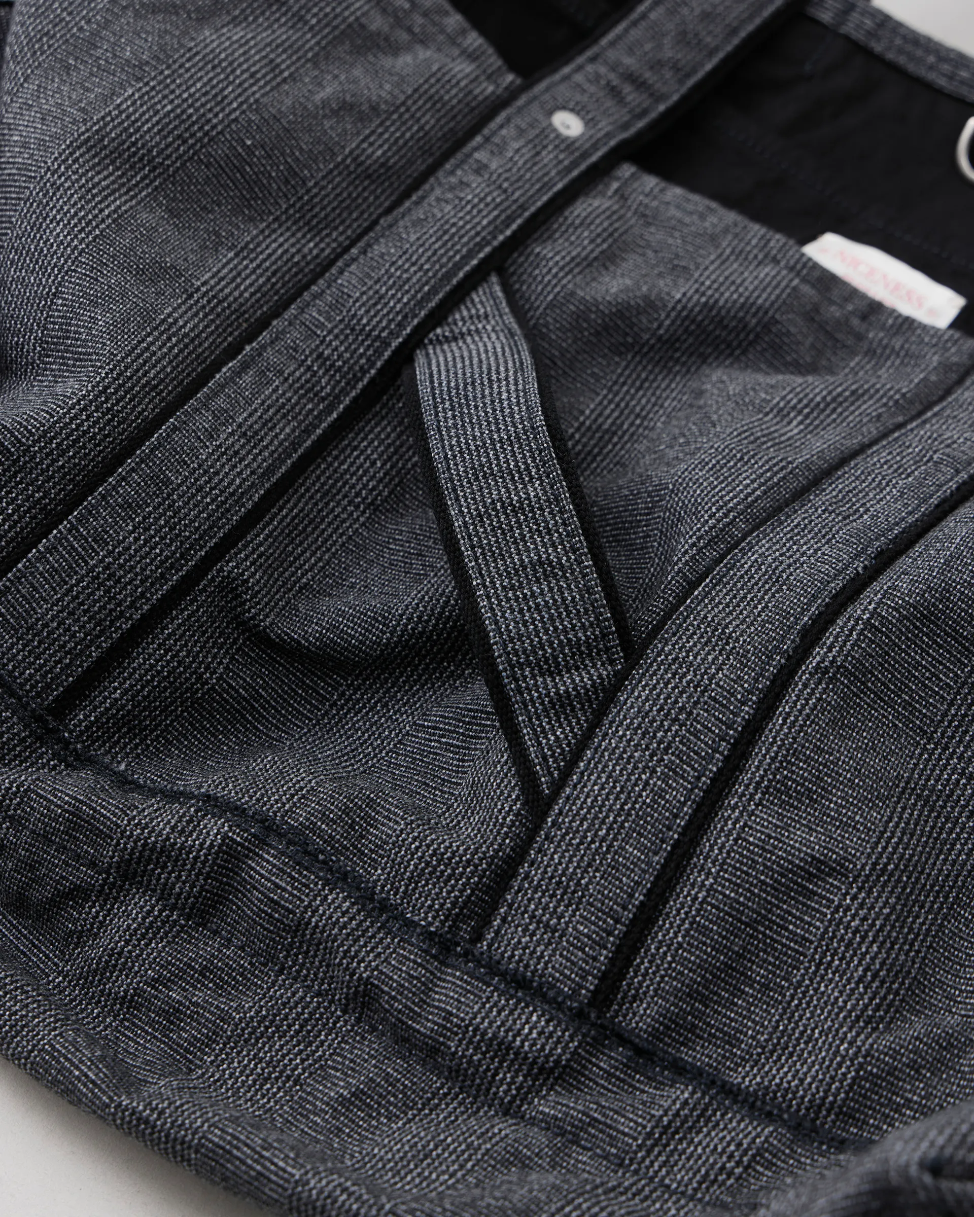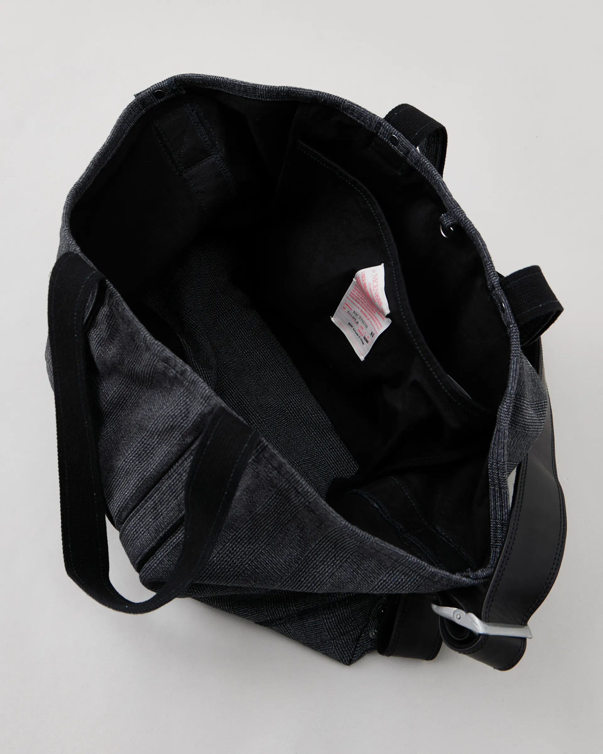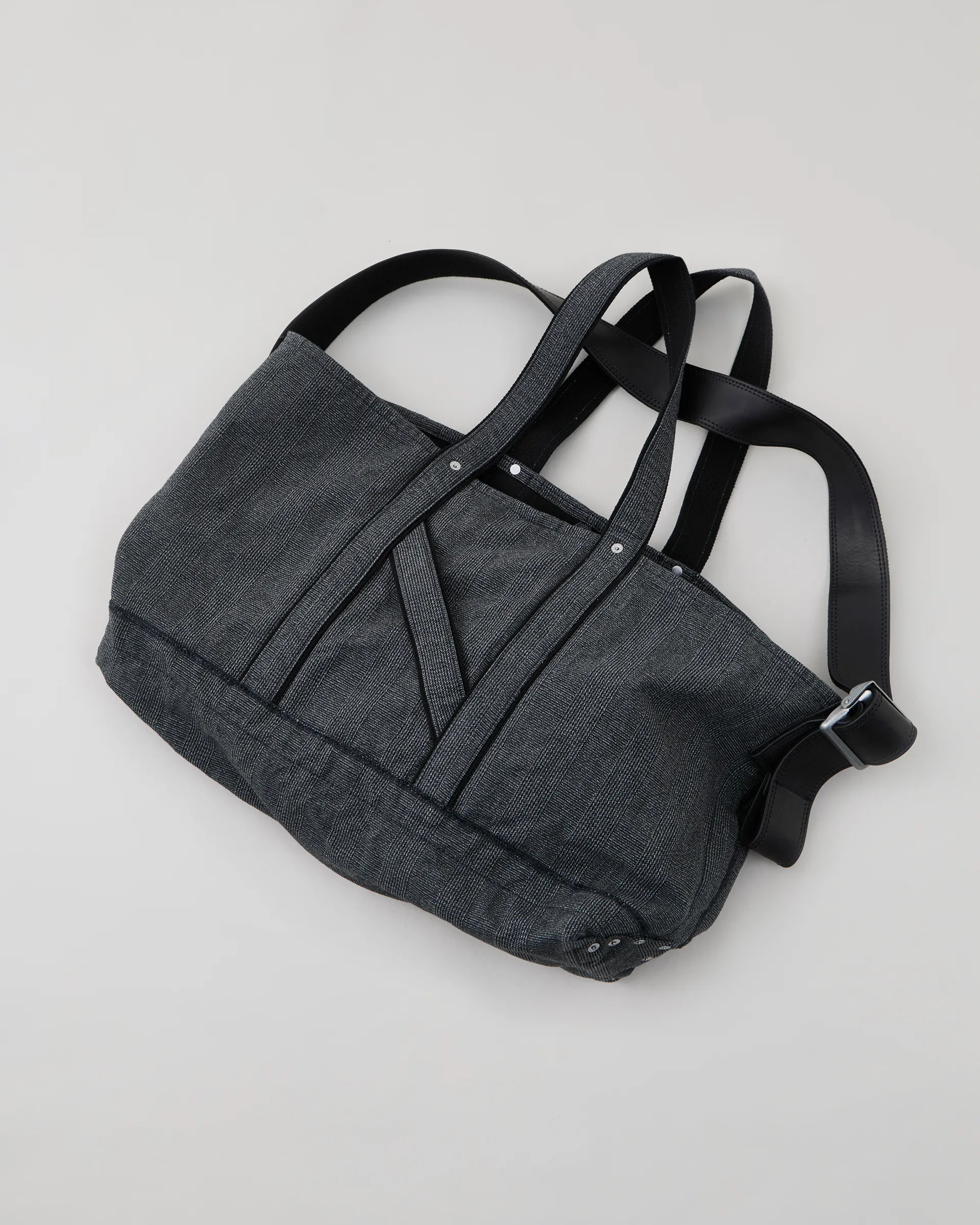 1950〜60年代のUSダック⽣地のムードを漂わせる先染めグレンチェック柄の生地を使用し、ワッシャー加工で仕上げたショルダーストラップ付きバッグ。デザインは1920〜50年代のアメリカのツールバッグと現代のメッセンジャーバッグを再構築しています。ショルダーストラップにはレザーを使用し、上質なムードを演出しています。