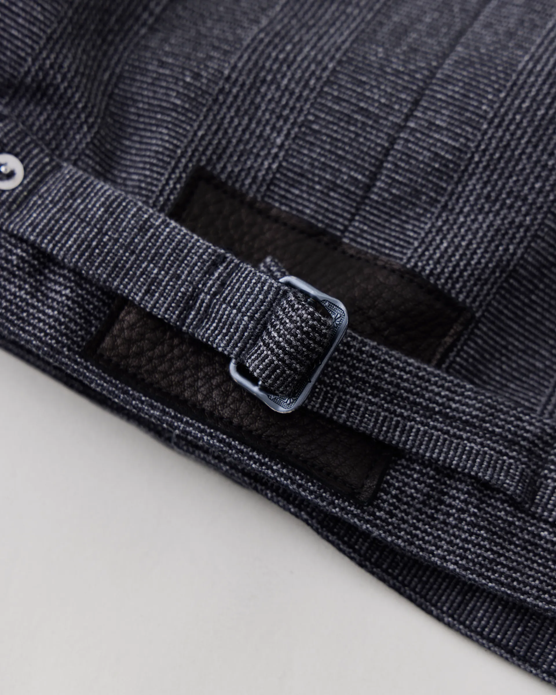 通常はカバンなどに使⽤する帆布を服地として柔らかく織り上げた⽣地で仕立てたトラッカージャケット。1950〜60年代のUSダック⽣地の表情を漂わせる先染めグレンチェック柄の生地を、ワッシャー加工で仕上げています。着物のような平⾯構成を特徴とし、着⽤することで立体的な丸みが生まれるパターン設計です。古き良きアメリカのトラッカージャケットをエレガントに再構築したデザインとなっています。