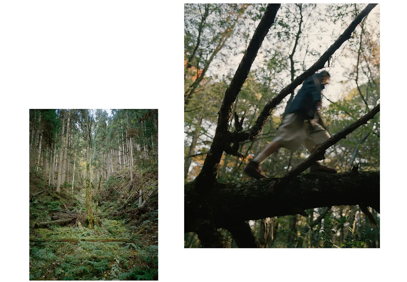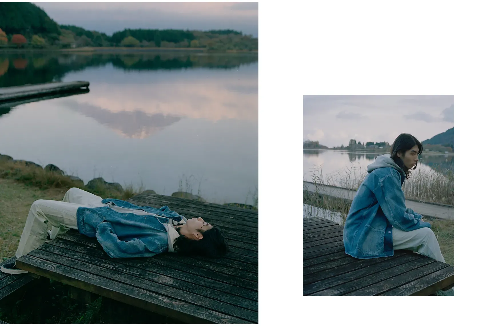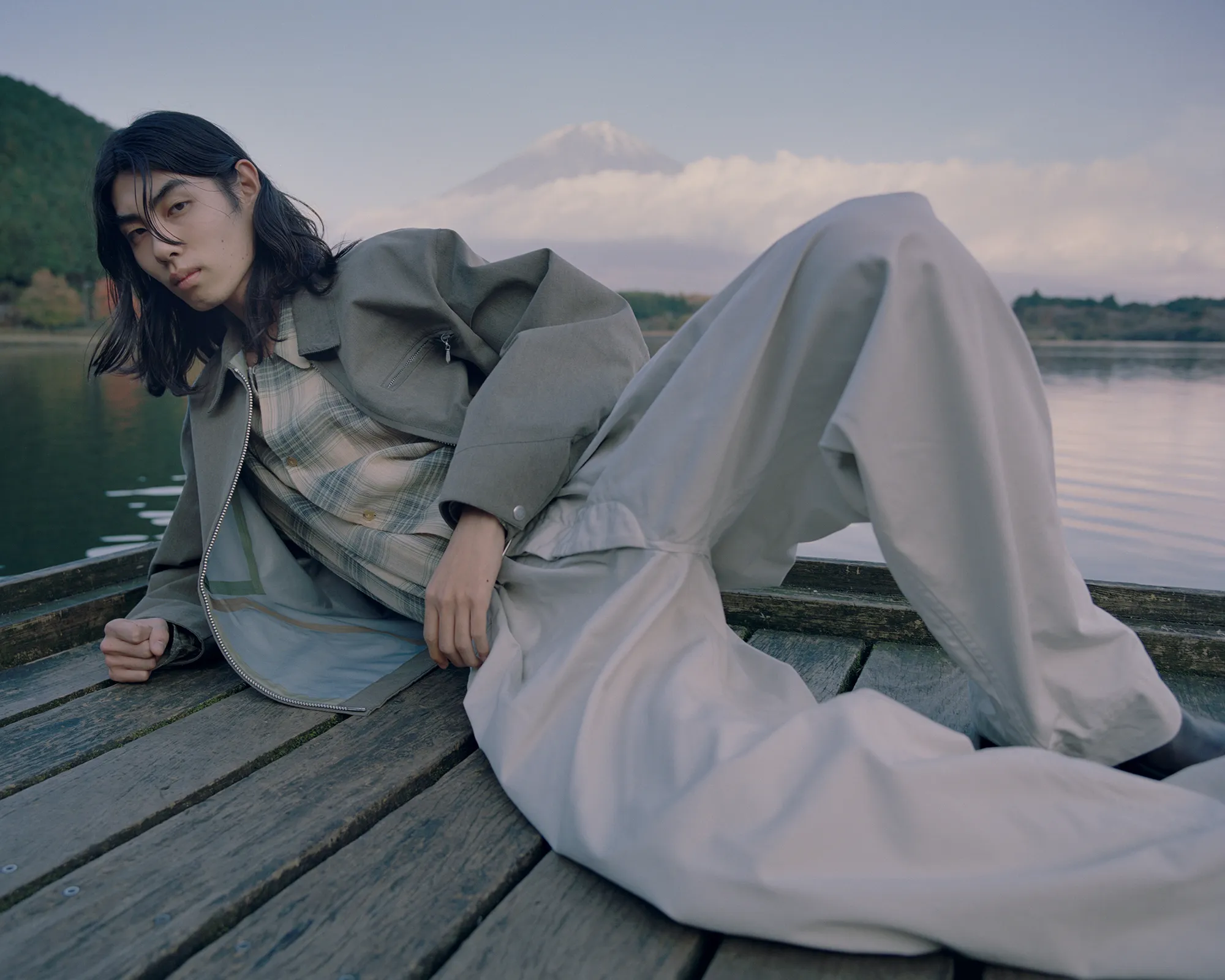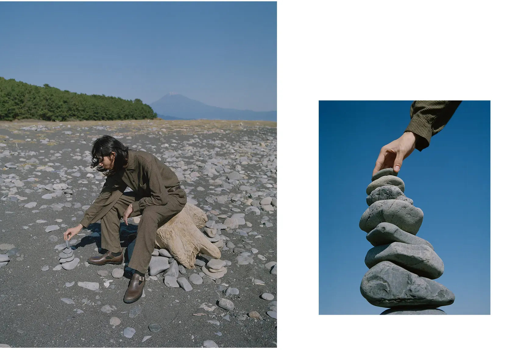 同郷の出身であるShoyaを引き連れた今回の旅路は、日本の精神性と美意識を色濃く反映した東海道五十三次と重なる。穏やかな風景が広がる両者の郷土である大阪から青春の舞台である東京へ。その道中にある富士山を象徴とする日本の自然と都市の狭間に物語を重ねていく。本コレクションでNICENESSは河井寛次郎の陶、須田剋太の書に通じる精神性を服づくりに反映させた。その思想とPiczoの視点とが重なり、記憶、風景、身体のあいだに潜む“ねじれの美”を映し出す。